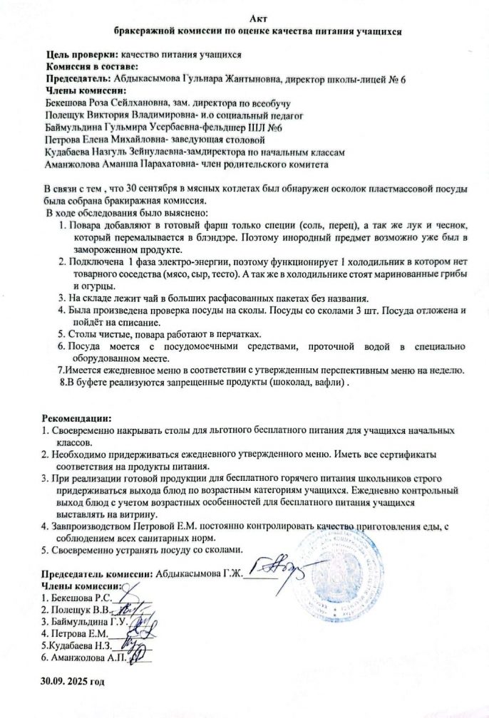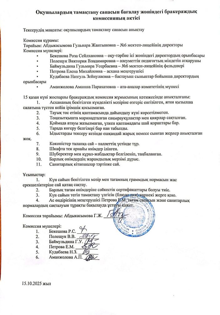 Акт оқушылардың тамақтану сапасын бағалау жөніндегі бракераж комиссиясы