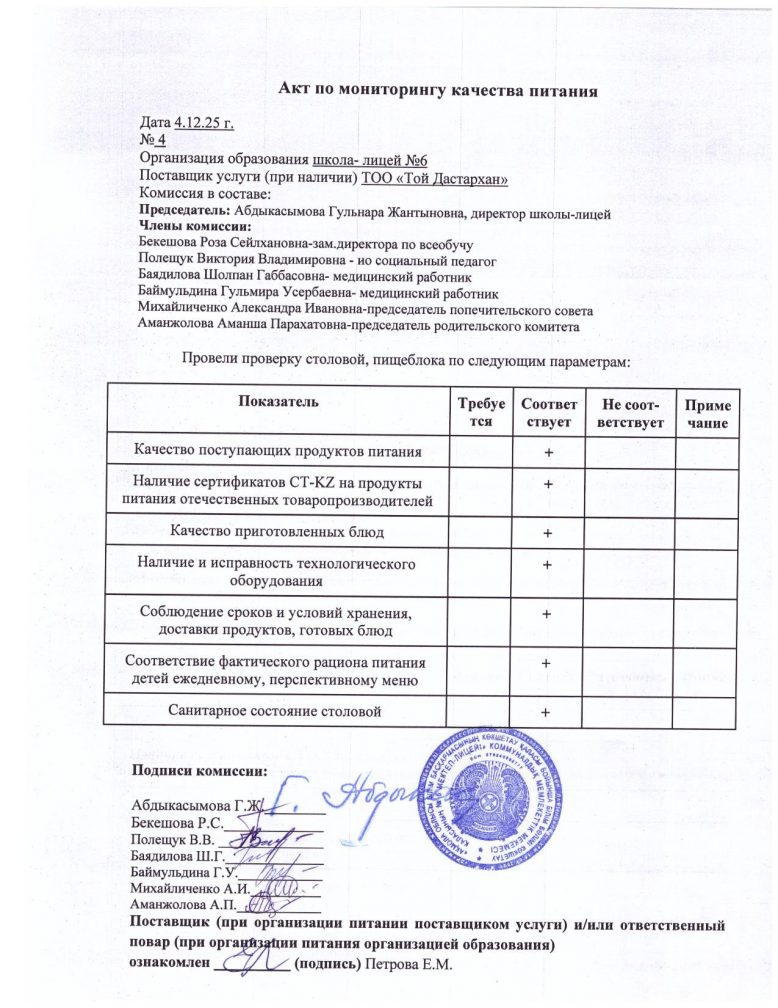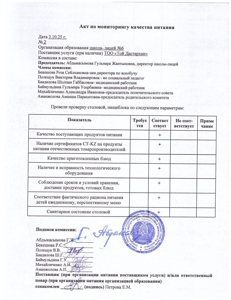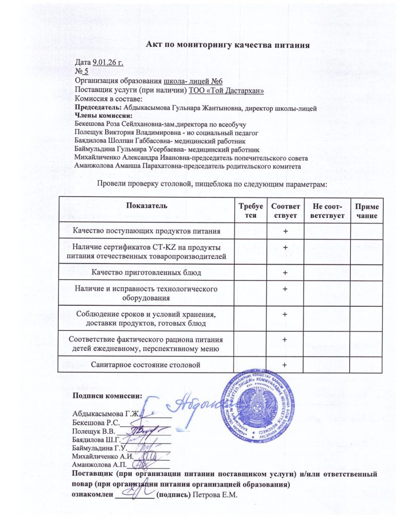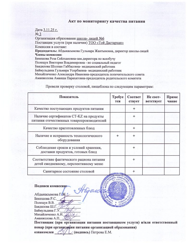 Тамақтану сапасын мониторингілеу актісі
