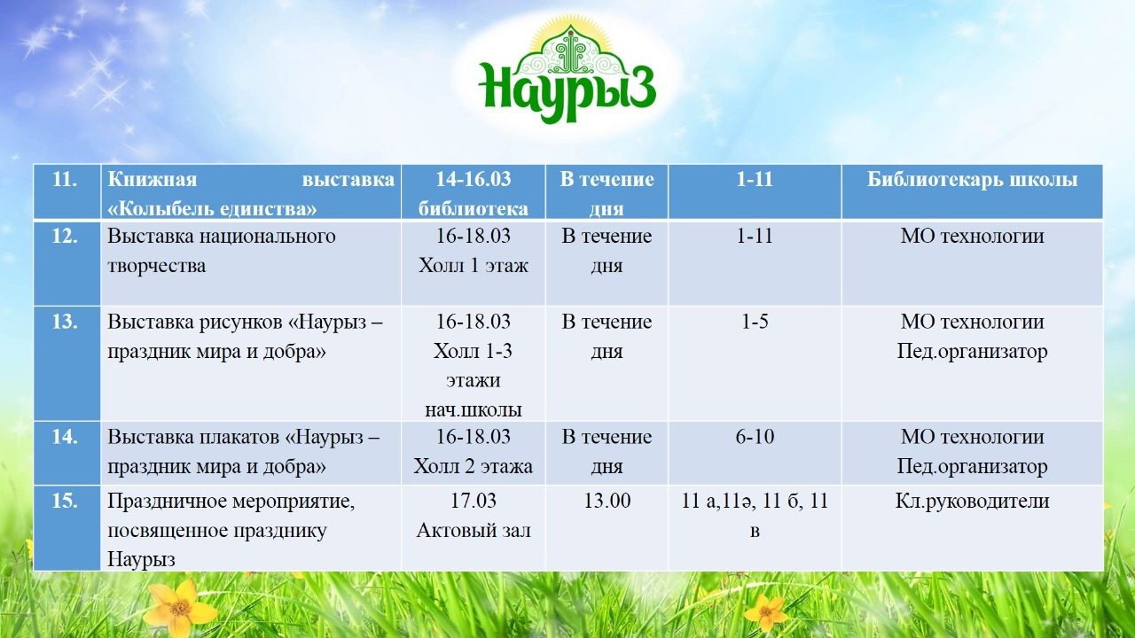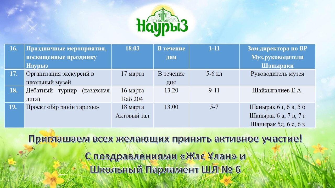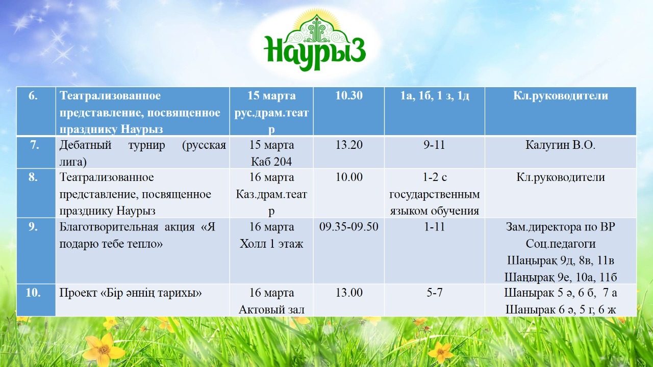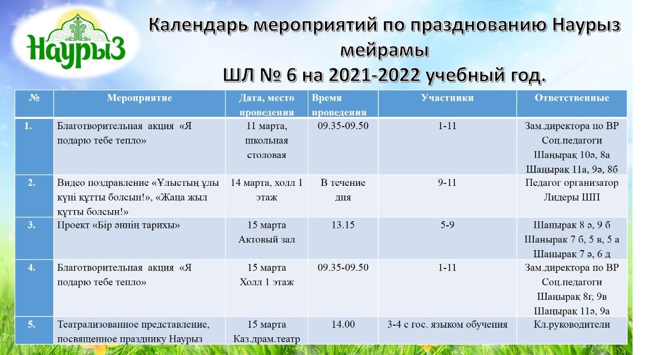 Календарь мероприятий по празднованию Наурыз мейрамы 2021-2022