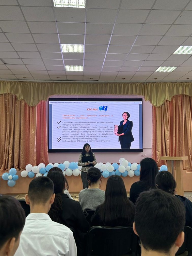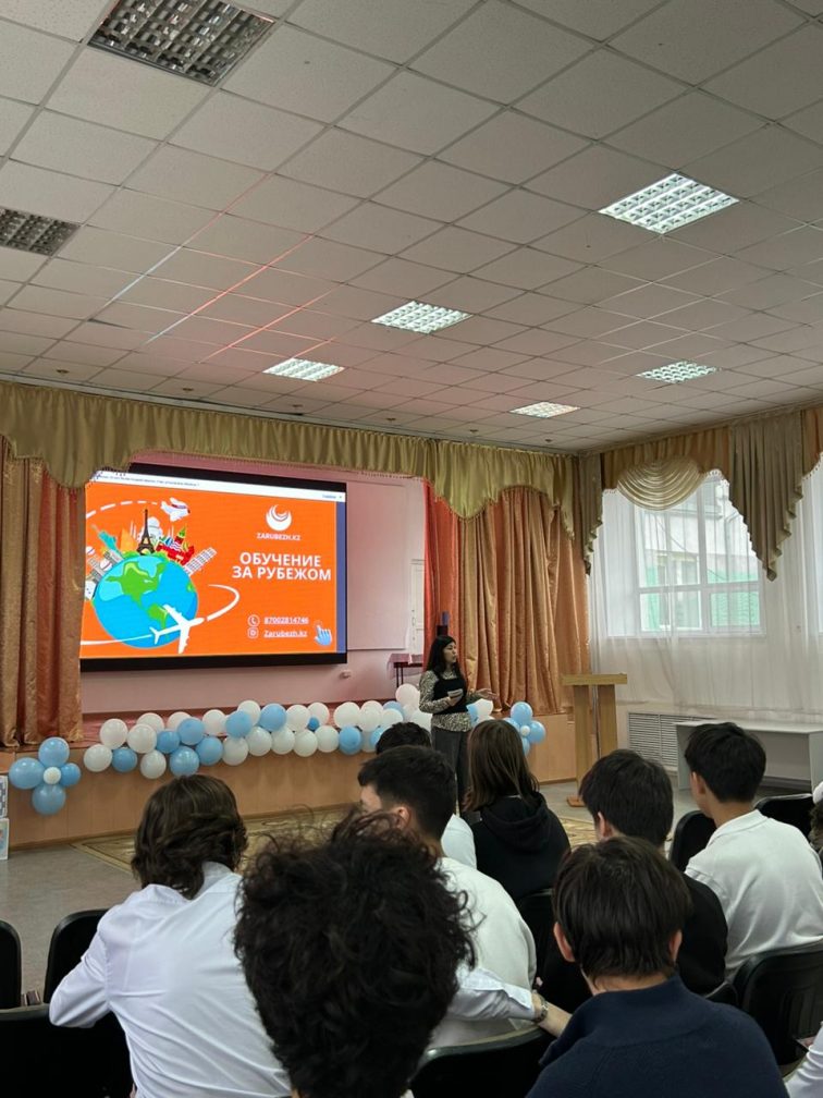 4 желтоқсан күні мектебімізге шетелде білім беру компаниясы (Zarubezh.kz) келіп, 11-сынып оқушыларымен кәсіби бағдар беру жұмыстарын жүргізді. Компания өкілдері шетелде білім алудың мүмкіндіктері, грант түрлері және түрлі елдердің талаптары жөнінде жан-жақты ақпарат берді. Кездесу барысында оқушылар өздерін қызықтырған сұрақтарын қойып, болашақ мамандық таңдауға қатысты пайдалы кеңестер алды. Бұл шара жас түлектердің әлемдік білім кеңістігіне қадам басуына бағыт-бағдар беретін маңызды кездесу болды.