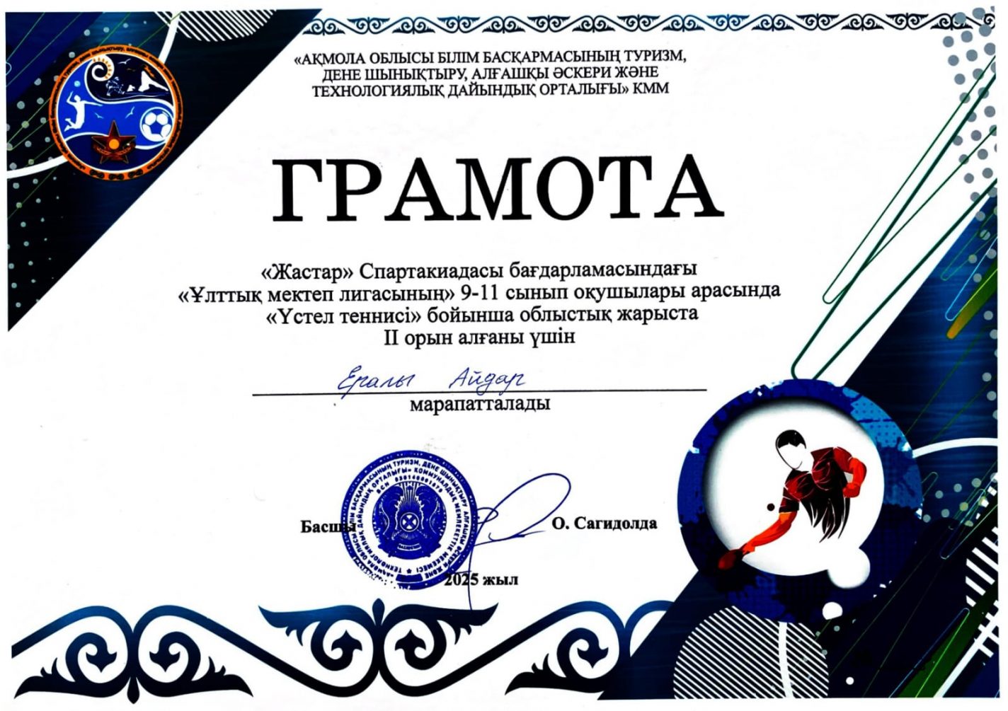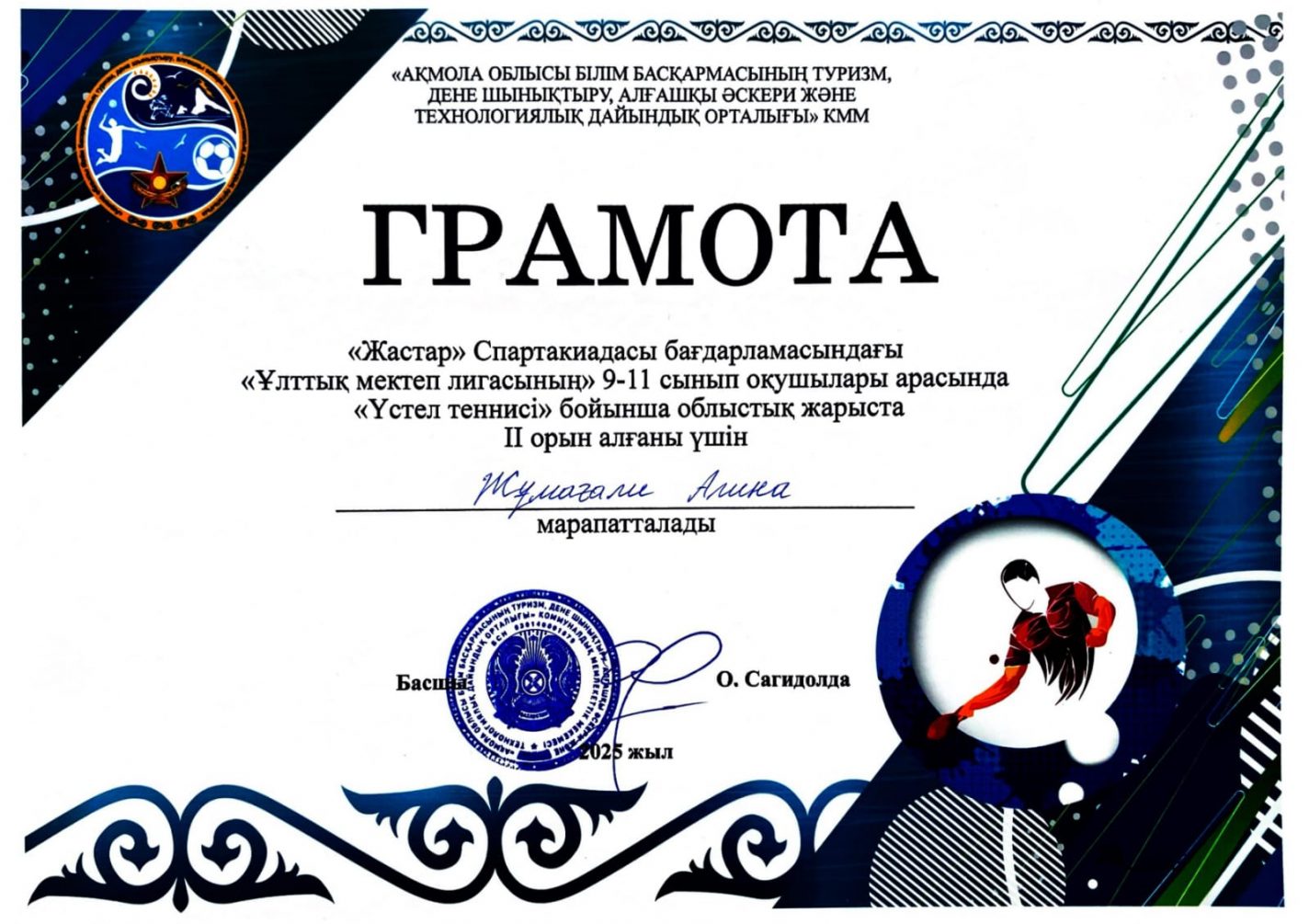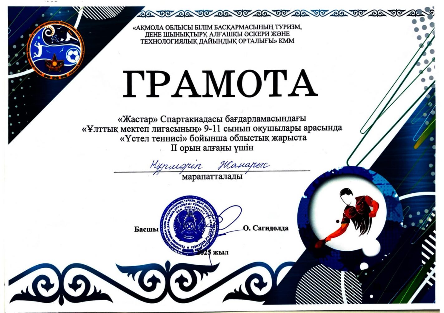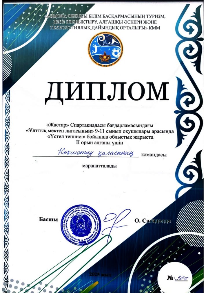 «Жастар» Спартакиадасы багдарламасындагы «ұлттық мектеп лигасынын» 9-11 сынып окушылары арасында «үстел теннисі» бойынша еткен облыстык жарыста командалық ойында  Жумағали Алина, Ералы Айдар, Нұршәріп Жанарыс IІ орынды жеңіп алды